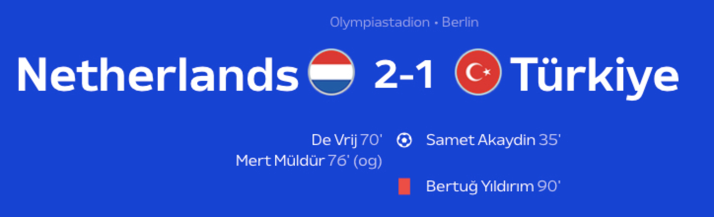 이후 계속 공방전을 이어가던 중 75분 경 튀르키예의 뮐뒤 선수의 자책골로 네덜란드가 2-1로 앞서나가기 시작합니다. 이후 남은 시간 다시 튀르키예가 계속되는 공격을 시도 했지만 결국 추가골은 기록하지 못하고 경기를 마무리 하게 되었습니다.