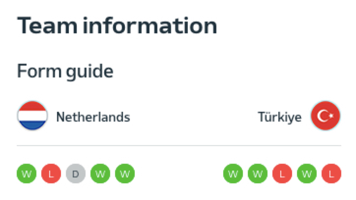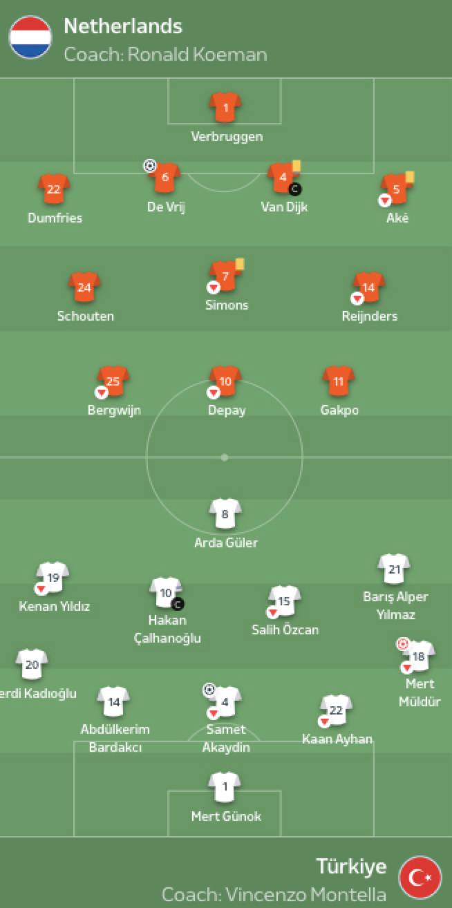 네덜란드와 튀르키예의 경기 역시 극적인 접전의 경기였습니다. 모든 전문가들의 예상은 네덜란드의 우세를 점쳤었는데요, 예상 외로 초반에는 튀르키예가 앞서 나갔습니다. 튀르키예의 사메트 아카딘 선수가 선제 헤딩골을 넣으면서 1-0으로 앞서 나갑니다. 그리고 전반이 종료 되었는데요,
