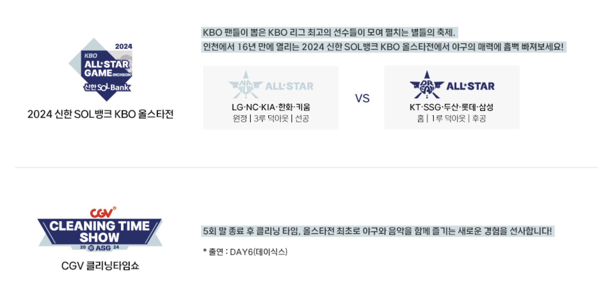 올스타전 경기는 TV 중계외 CGV에서도 중계를 볼 수 있는데요, 5회말 종료 후 클리닝 타임에는 올스타전 최초로 야구와 음악을 함께 즐기는 CGV 클리닝 타임쇼도 진행된다고 합니다.