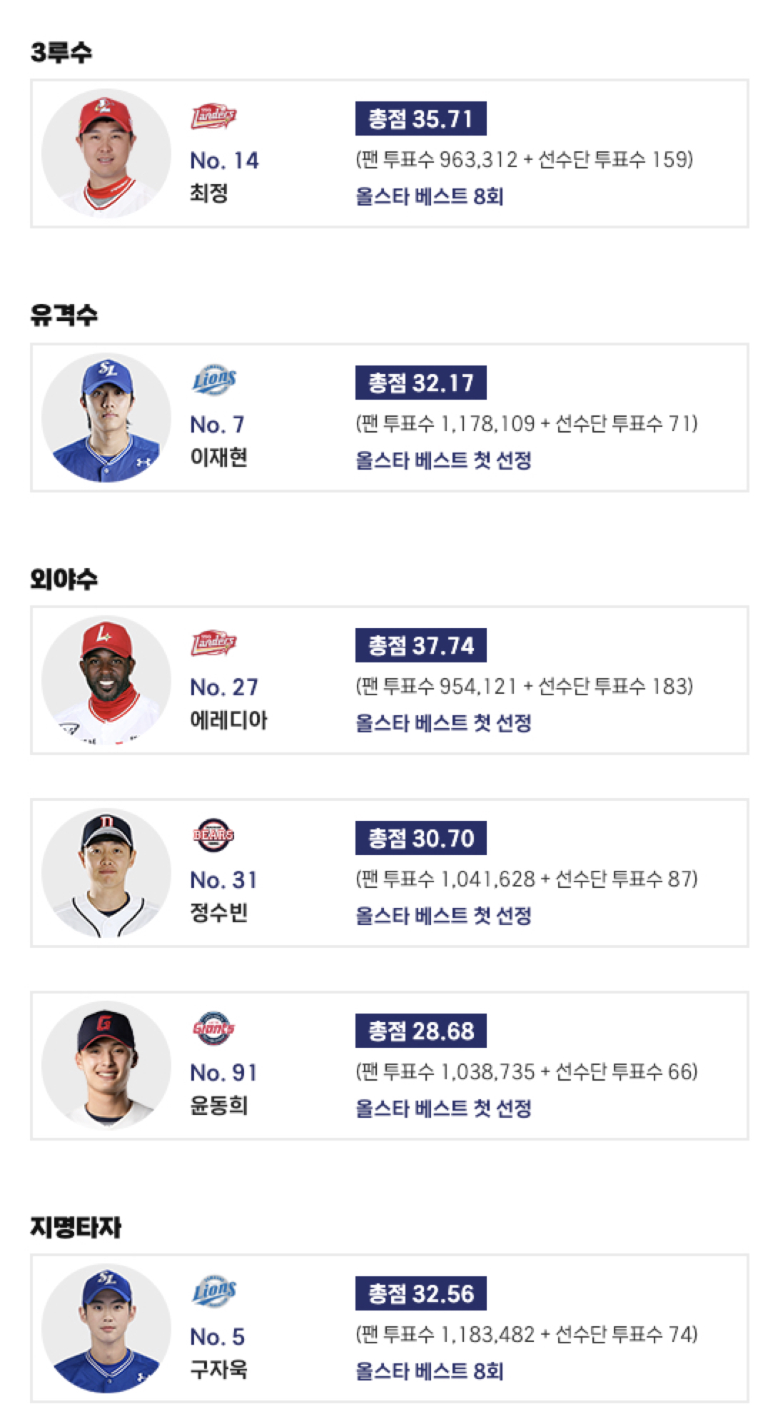 그리고 포수의 경우 드림 올스타는 양의지 선수, 나눔 올스타는 박동원 선수가 선발 되었고, 지명타자는 삼성의 구자욱 선수와 기아의 최형우 선수가 선발 되었습니다.