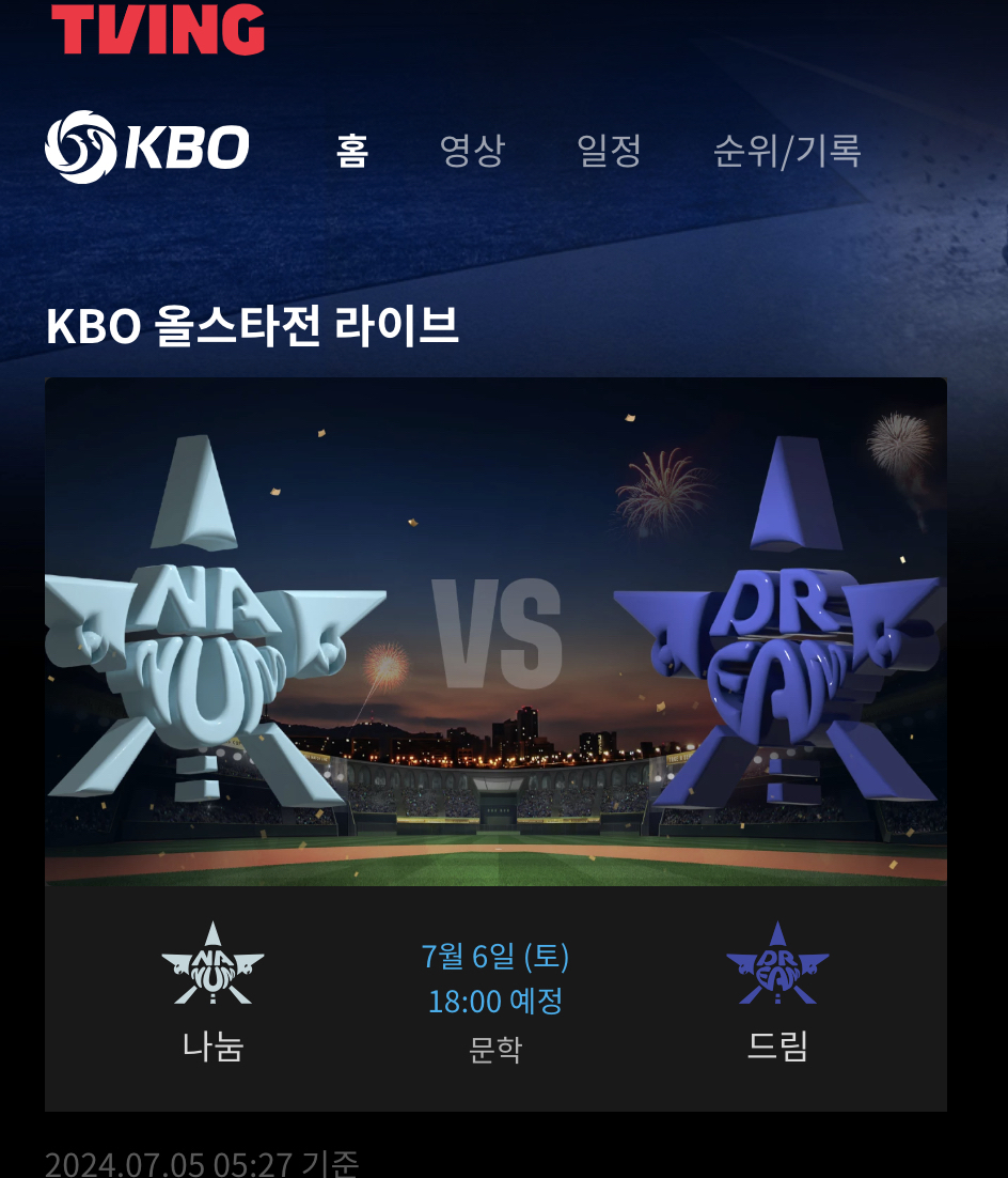 이 번 2024 KBO 프로야구 올스타전에 한하여 티빙(TVING)이 무료로 중계방송을 볼 수 있도록 한다고 합니다. 그동안 유료로 보기에 부담이 되신 분들은 무료로 티빙 서비스에서 같이 보실 수 있습니다.